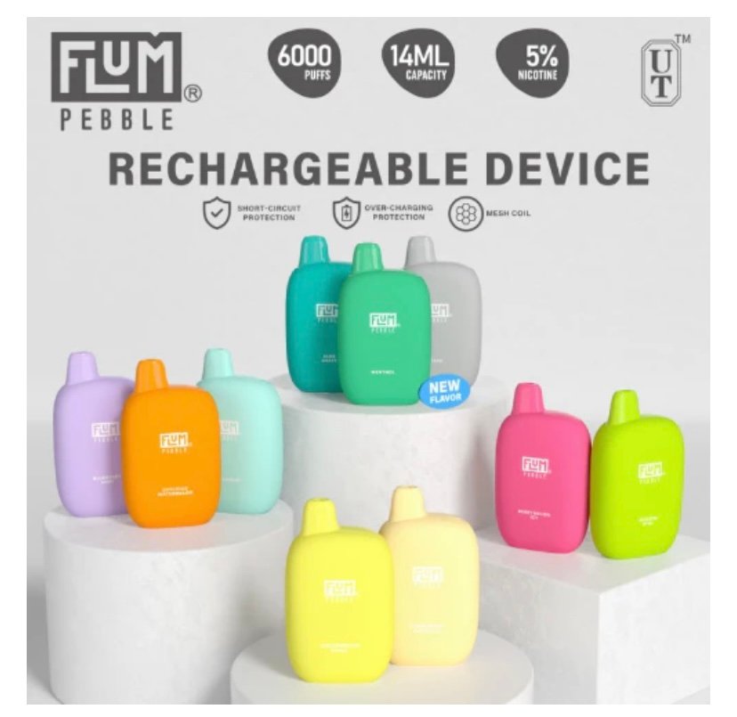 FLUM introduces the FLUM Pebble, a 6000 puffs rechargeable disposable vape from one of the most popular disposable manufacturers thus far. The FLUM Pebble packs in 14ml of vape juice at 5% nicotine, paired with a mesh coil for ultimate flavor and vapor delivery. Powering the Pebble is a 600mAh internal battery which is rechargeable via USB-C.
