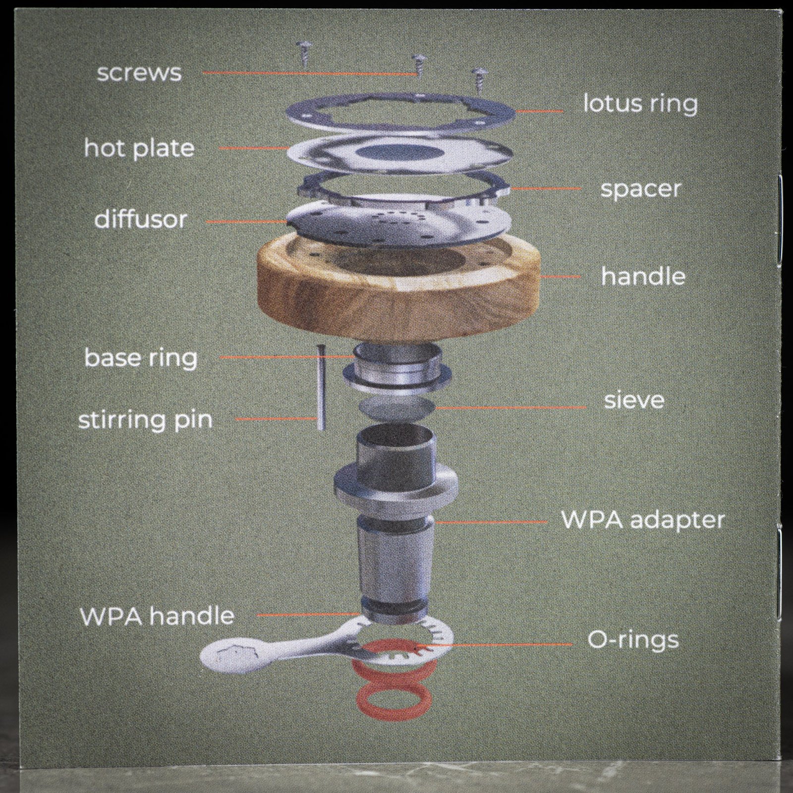 To the right you can see everything that goes into the Lotus. There really isn’t much that can go wrong with your Lotus but parts like the hot plate, screens and o-rings can be replaced if needed.